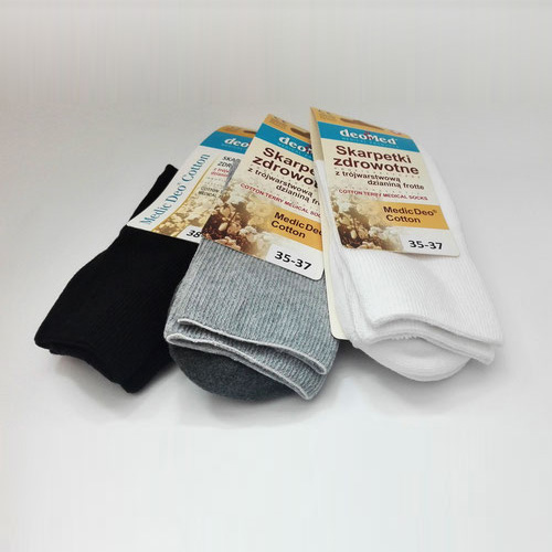Specjalna konstrukcja cholewki i niewielka domieszka nowoczesnego włókna Lycra® w całym wyrobie powodują idealne bezuciskowe przyleganie do nóg i maksymalną elastyczność - nietamowanie przepływu krwi i komfort nawet dla opuchniętych nóg.